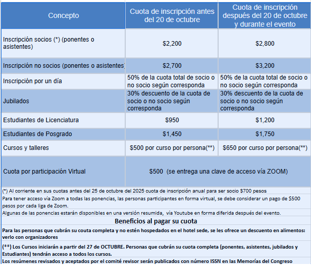 Los Estudiante de Licenciatura o Posgrado deben enviar copia de credencial o comprobante. Incluye publicación del trabajo aceptado como Ponencia con número ISSN solo si envía el extenso y es aceptado por el comité revisor. La cuota de recuperación incluye el acceso a todas las ponencias, acceso a las memorias del evento y Certificado de participación como ponente o asistente Público en General tiene acceso virtual vía Zoom pagando la liga respectiva, con lo cual puede obtener la constancia de participación respectiva. Para respetar el precio de la cuota de recuperación, es necesario ir al corriente en su cuota mensual o anual según corresponda. ** Las cuotas estan establecidas en pesos mexicanos Las cuotas no generan IVA, la cuota es neta. Para entregarle su factura si es que la solicita, favor de proporcionar razón social, RFC y dirección completa con código postal. |